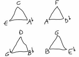 Popularized by John Coltrane, these progressions move through keys by major thirds. In “Giant Steps,” the progression modulates between B, G, and Eb. Example