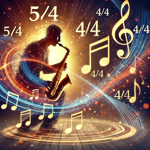 A dynamic and engaging image depicting the rhythmic interplay of 5_4 and 4_4 in jazz music. The visual includes a jazz musician performing.